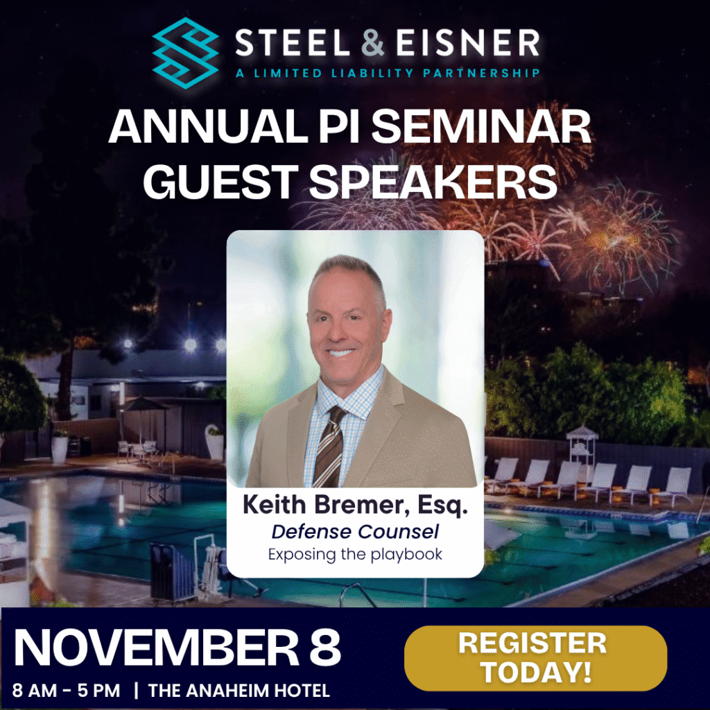 We are excited to share that Partner Keith Bremer is teaming up with Hosts Steel & Eisner to present during the Annual PI Seminar at the Anaheim Hotel on Saturday, November 8th.
