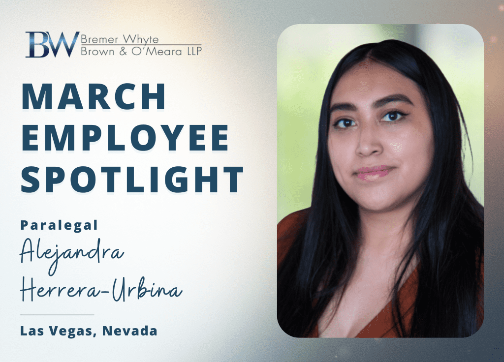 Meet Alejandra! Alejandra is a Paralegal at the Las Vegas office of Bremer Whyte Brown & O’Meara, LLP. Originally from Los Angeles, California, she moved to Las Vegas just before starting middle school. It was here in Las Vegas that she met her husband, and together they share a cocker spaniel named Charlie.